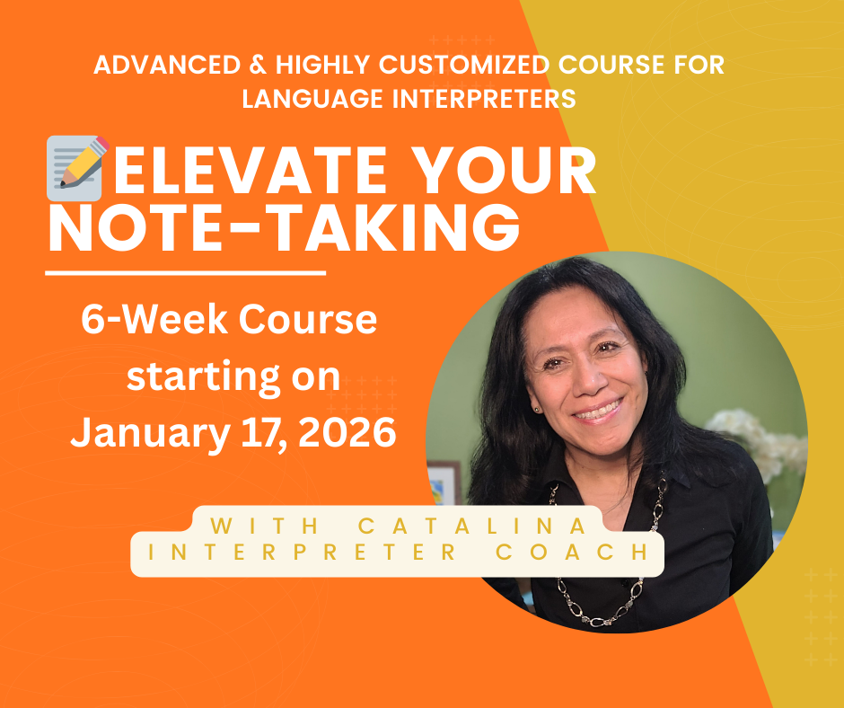 I’m helping professional interpreters to go from being all over the place with their note-taking to developing a reliable technique and stick to it in my highly customized, and advanced course (12 CEUs) ELEVATE YOUR NOTE-TAKING — it looks like this: